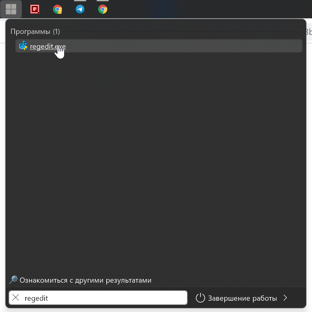 Запустите редактор реестра Windows. Для этого в меню Пуск в поиске напишите regedit и запустите приложение.