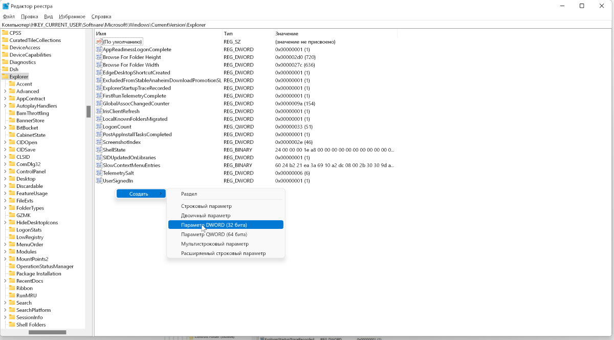 Теперь перейдите по следующему пути: HKEY_CURRENT_USER\Software\Microsoft\Windows\CurrentVersion\Explorer
