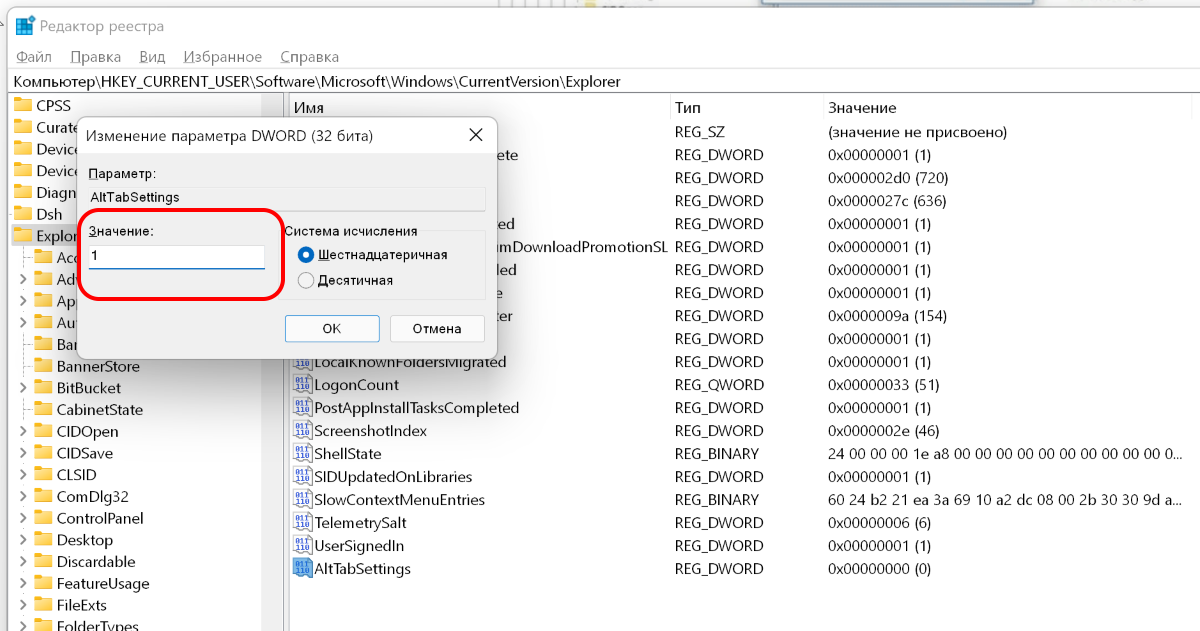 Нажмите правкой кнопкой по свободному участку на правой панели и создайте новый Параметр DWORD (32 бит2) с названием AltTabSettings.