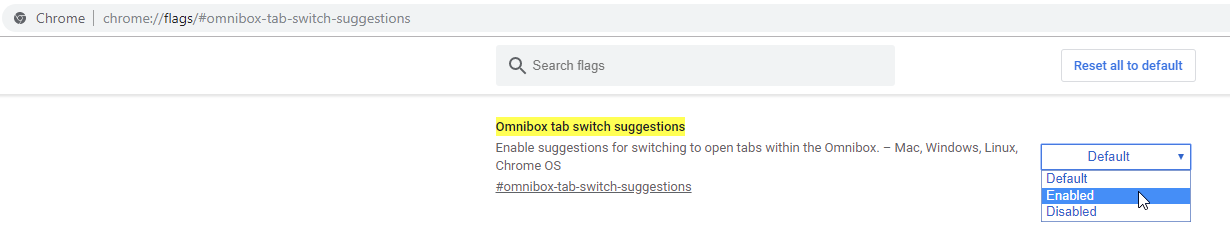 Для этого открой браузер Google Chrome и перейди по адресу chrome://flags/#omnibox-tab-switch-suggestions и в выпадающем списке выбери Enabled.
