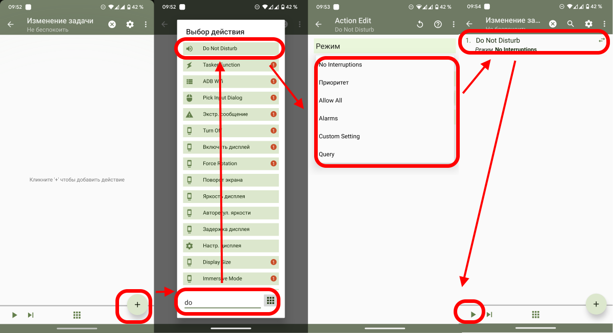Теперь снова нажмите на плюсик для создания нового действия. Далее в поиске введите Do и выберите Do Not Disturb. На следующем шаге в выпадающем списке Режимможно выбрать нужный вам тип режима Не беспокоить. Теперь можно вернуться обратно и нажать на кнопку Play, чтобы убедиться, что телефон переходит в указанный режим.