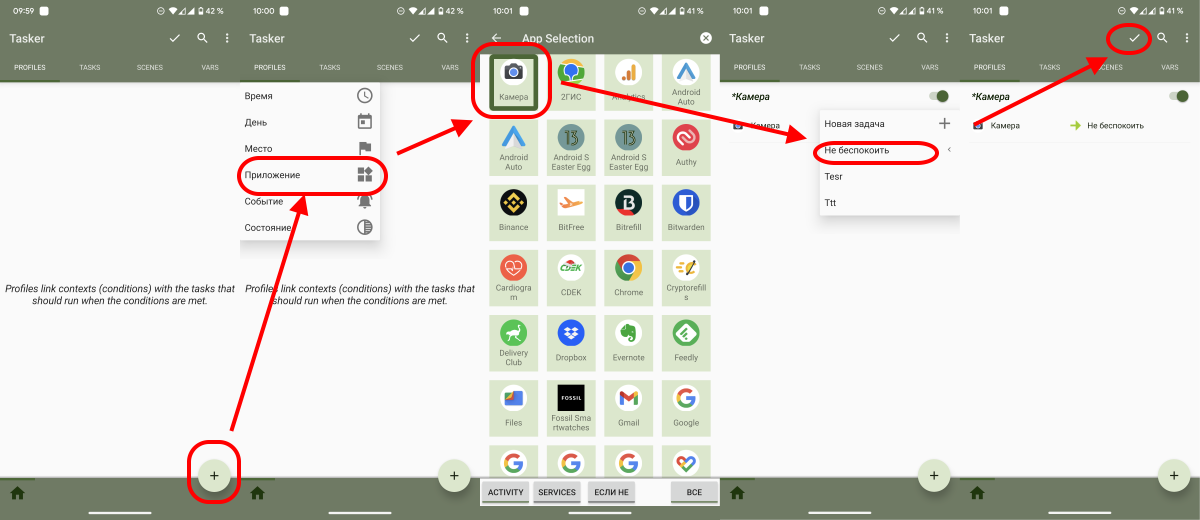 Затем выберите созданную ранее задачу Не беспокоить и сохраните профиль. Готово! Теперь при включении камеры ваш смартфон будет автоматически переходить в режим Не беспокоить.