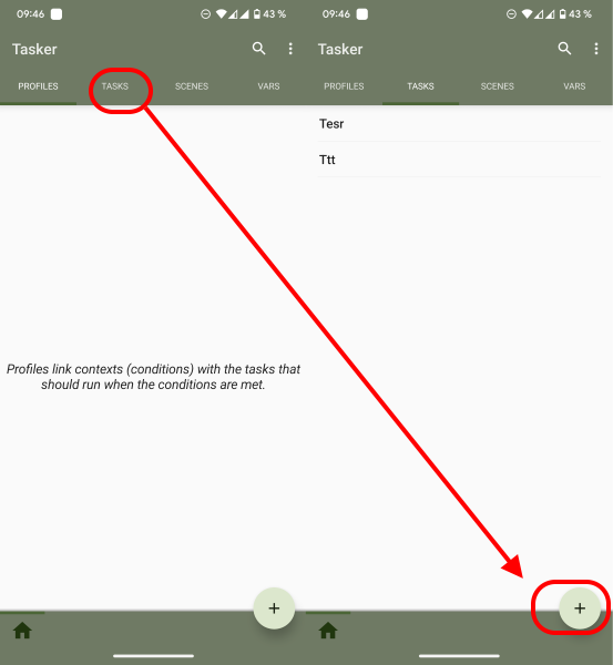 Откройте Tasker и перейдите на вкладку Task, а затем нажмите кнопку создания новой задачи.