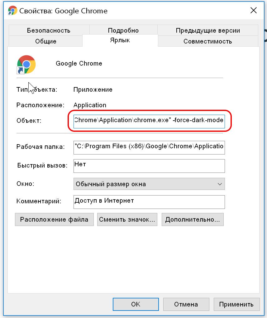 Создайте такой ярлык или нажмите на уже готовом ярлыке правой кнопкой и выберите пункт «Свойства» и в строке «Объект» в конце добавьте –force-dark-mode , нажмите Примерить и OK.