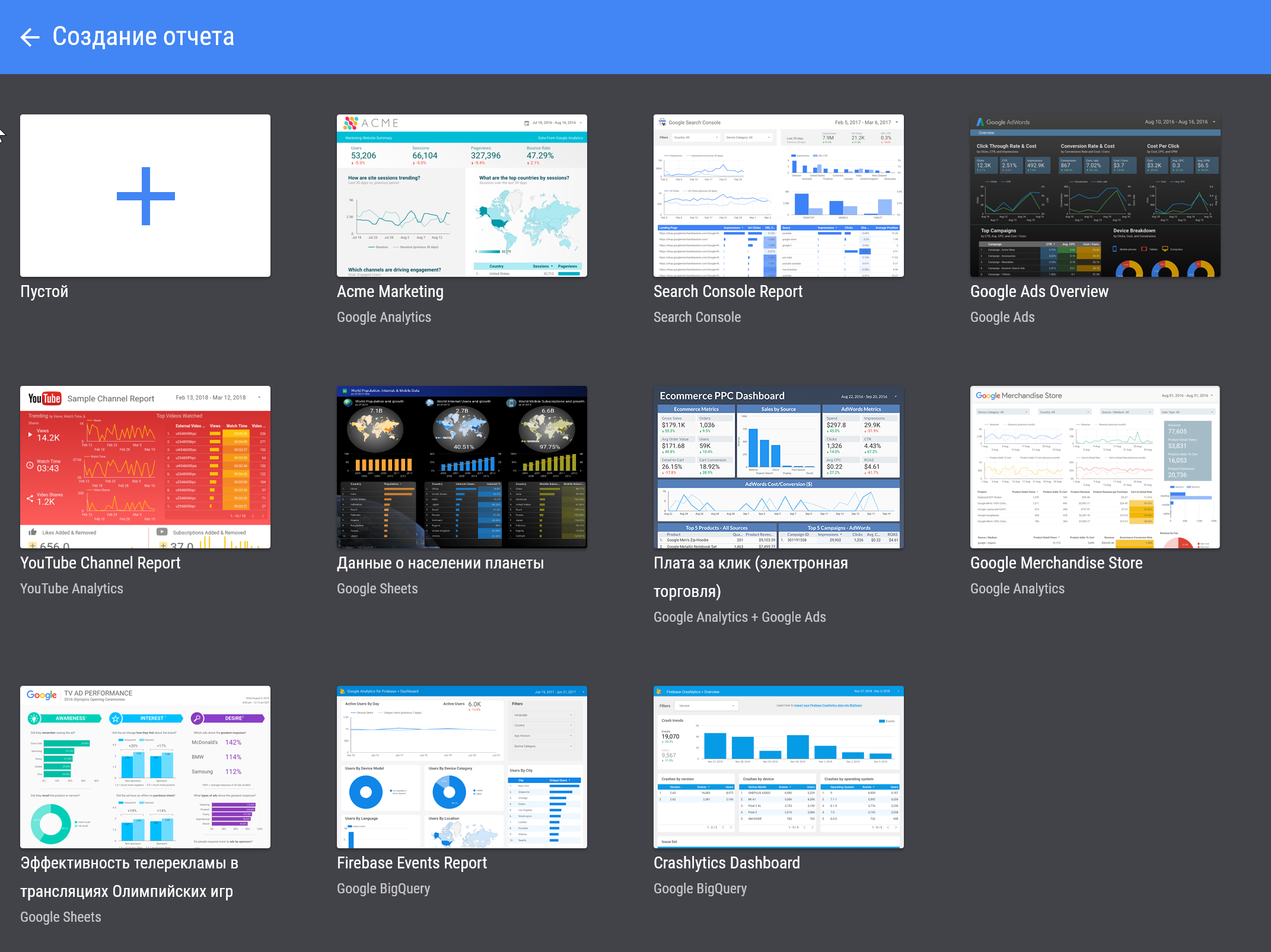 Как вы заметили, в шаблонах есть возможность создать отчёт на основе поисковых запросов, Google Ads, аналитики YouTube и пр.