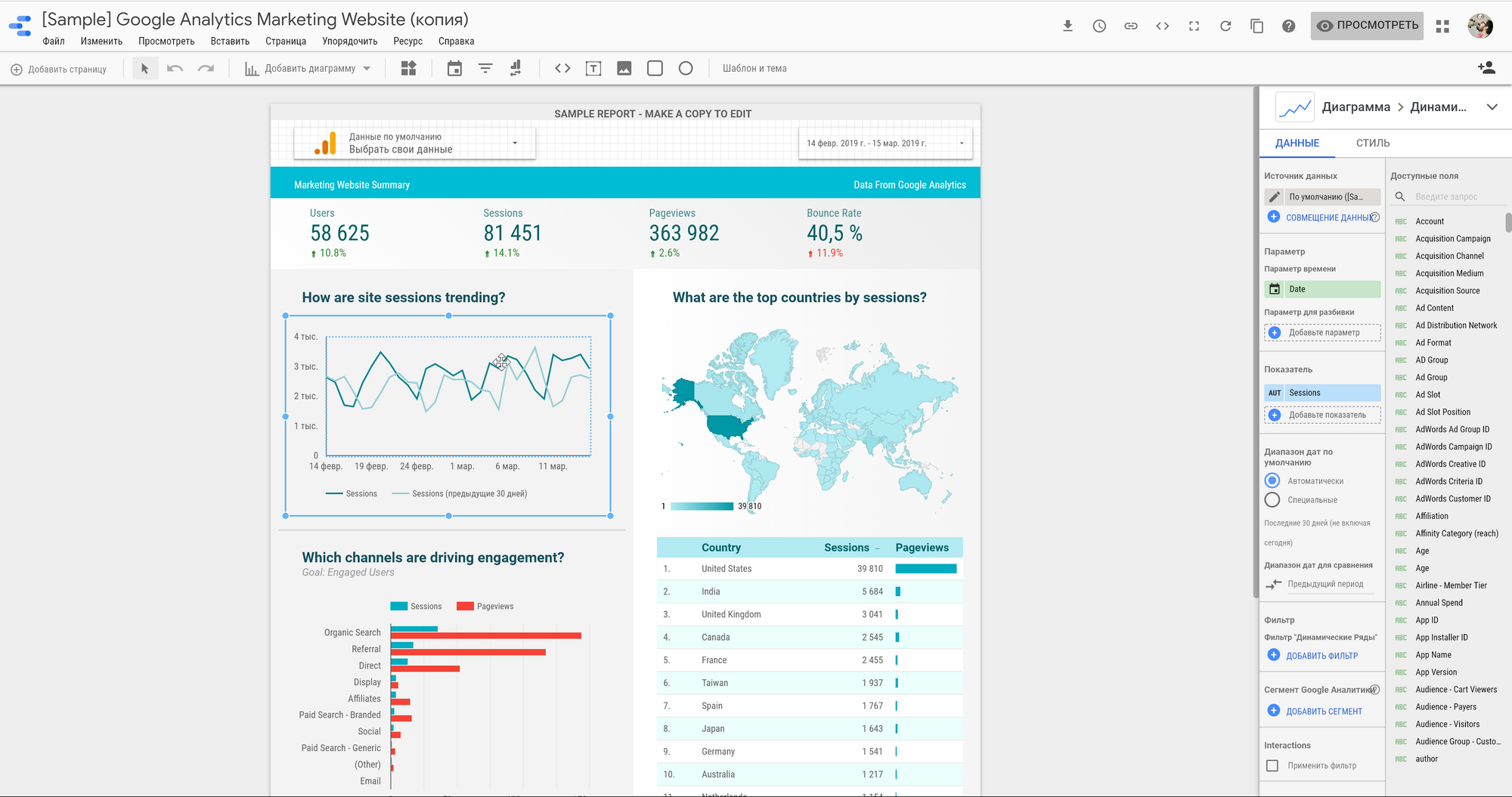 После авторизации в сервисе всё совсем просто. Выбираем один из шаблонов (в нашем случае Acme Marketing на основе Google Analytics), и вперёд: