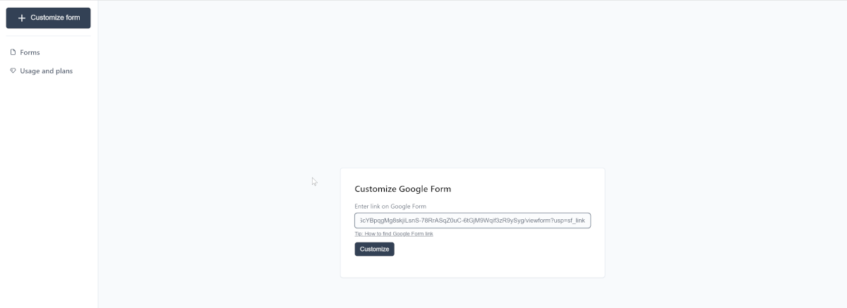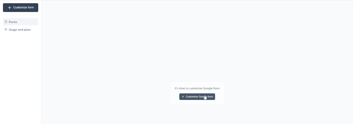 Исправить это упущение поможет сервис CustomGForm, который за три простых шага поможет встроить форму с нужным вам дизайном. Для этого нужно авторизоваться в сервисе и нажать кнопку +Customize Google Form.
