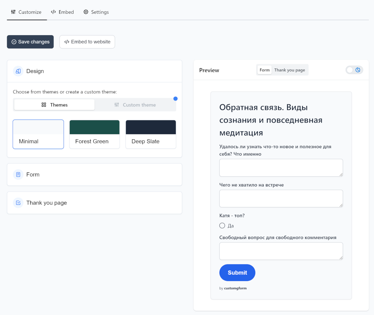 Если всё сделано правильно, вы увидите мастер настройки будущей формы и превью. Вы можете выбрать один из трёх предустановленных дизайнов либо настроить его самостоятельно.