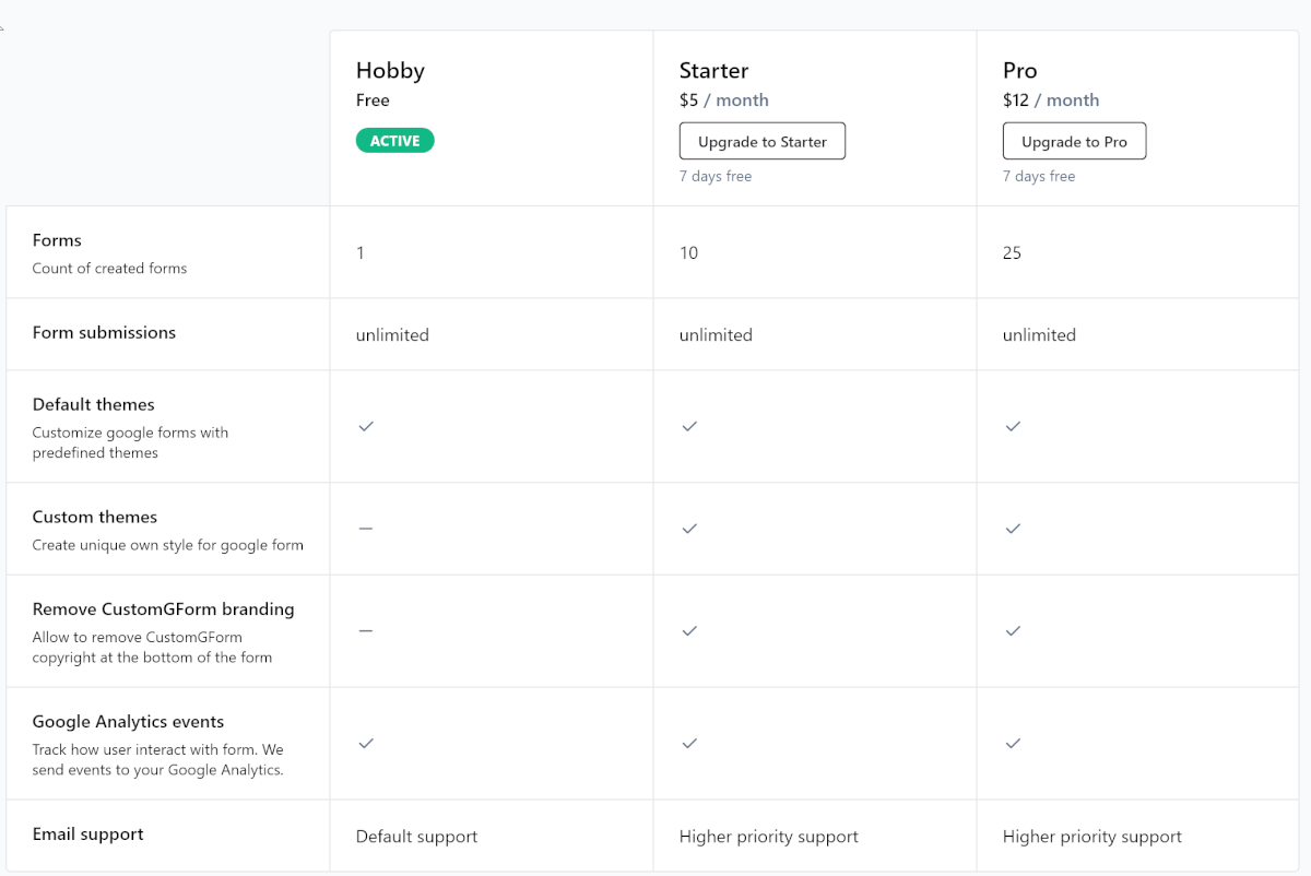 CustomGForm можно пользоваться бесплатно, если вам хватит одной формы и не нужна её полная настройка. Иначе придётся оплатить подписку, которая начинается от $5 в месяц за десять форм.