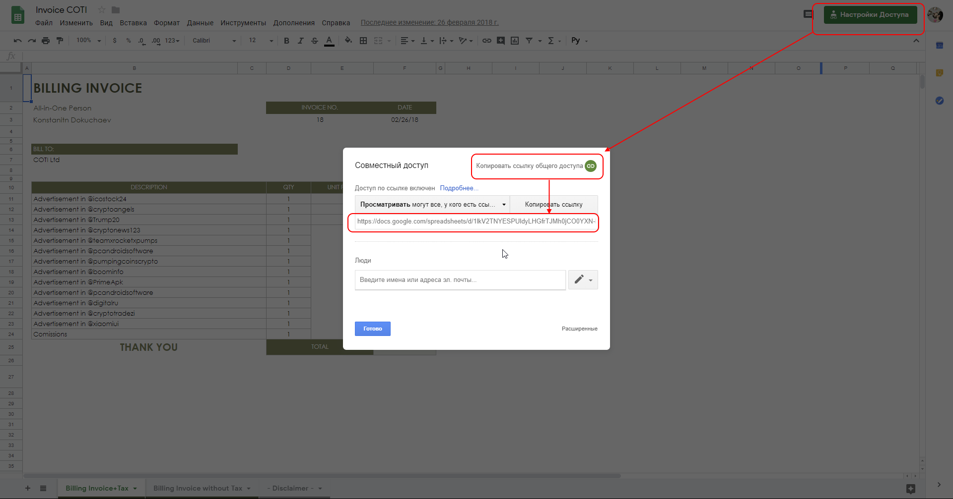 Для этого откройте нужную таблицу и нажмите кнопку «Настройки доступа». В появившемся окне нажмите «Копировать ссылку общего доступа» и сохраните полученную ссылку.