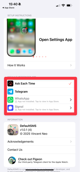 Для этого после установки приложения назначьте его в качестве приложения для сообщений по умолчанию, а в настройках DefaultSMS выберите нужный вам мессенджер, или выберите пункт Спрашивать каждый раз.