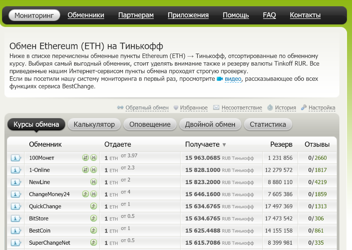 Электронные средства находятся под надежной защитой в кошельках пользователей. Но что делать, если необходимо вывести Ethereum на карту банка ТКС. На сегодняшний день самым оптимальным способом является использование виртуальных обменников. Транзакции проводятся быстро, оформление операции не требует особых навыков. Выгодный вывод Ethereum (ETH) на Тинькофф осуществляется через мониторинговый портал https://www.bestchange.ru/ethereum-to-tinkoff.html. Выбираете валюту, которую хотите поменять, и какую получить взамен. Портал автоматически подбирает список ресурсов. Для сделки нужно правильно проанализировать результаты поиска: