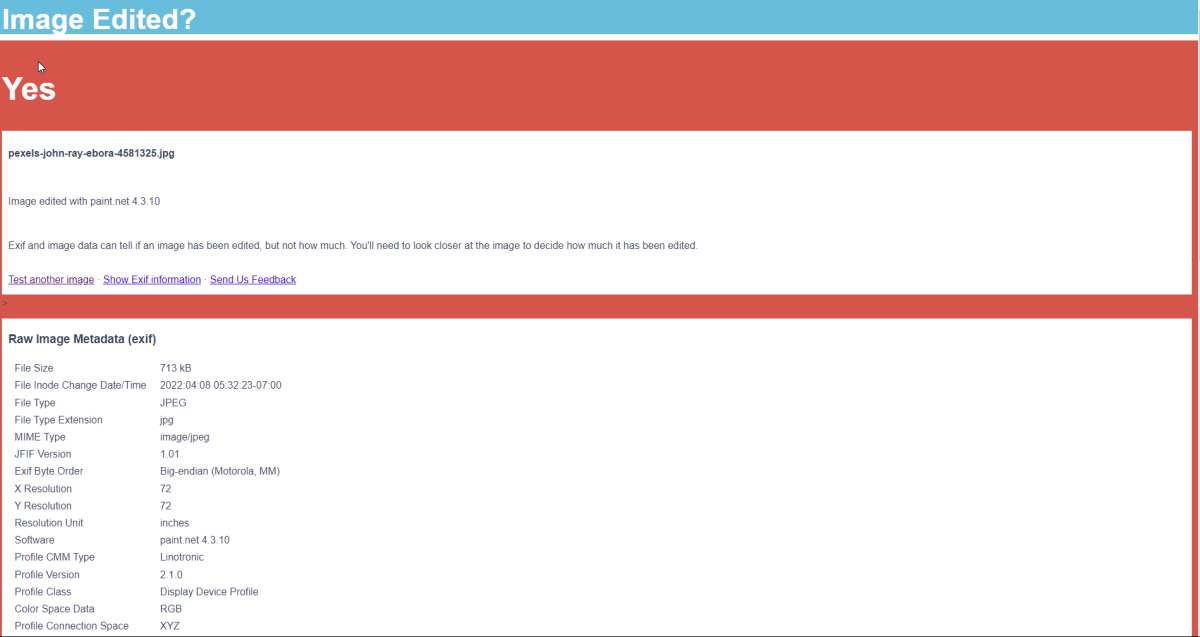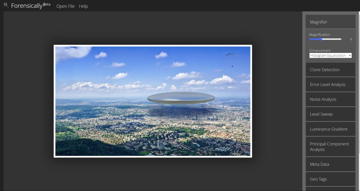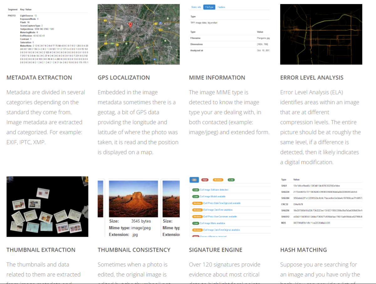 Программное обеспечение выявляет монтаж с помощью проверки снимка на ошибки. Кроме того, сервис может сравнивать исходную картинку с её миниатюрой. Если программа нашла отличия, пользователь увидит уведомление о том, что фото изменяли. Дополнительно сервис может извлекать из загруженных файлов текстовую информацию и геотеги, отмечать на карте примерное место съёмки. Программа бесплатная.