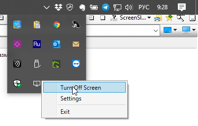 ScreenSleep поможет выключить экран компьютера по горячей клавише или через меню в трее.