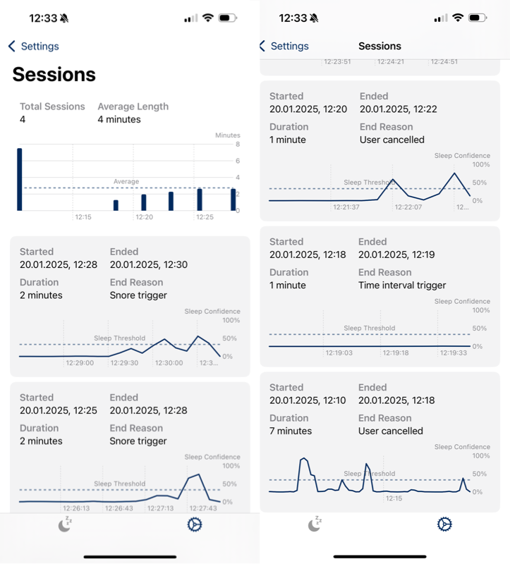 Кроме этого, приложение ведёт статистику ваших сессий сна, которую также можно посмотреть в настройках. Из неё можно понять, во сколько вы активировали приложение и когда оно отреагировало на ваши действия.