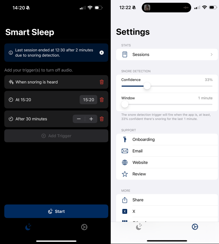 В случае с первой настройкой по храпу могут возникнуть проблемы, и Smart Sleep Timer не будет реагировать на него. Для этого в настройках в разделе Snore Detection нужно выставить чувствительность и время реакции. При этом пауза будет ставиться не только при храпе, но и глубоком дыхании.