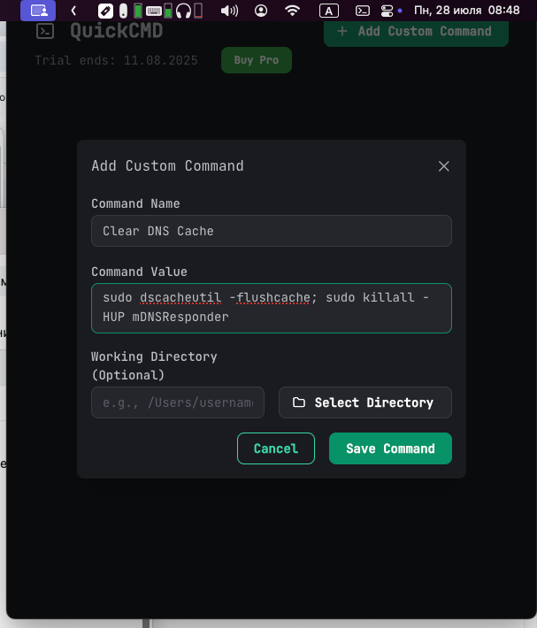 Достаточно установить приложение QuickCMD, в котором вы сможете создать собственный список из команд. А затем быстро запускать нужные прямо из Строки меню.