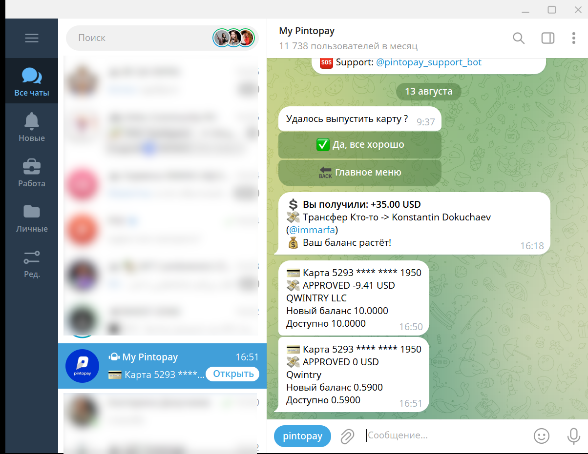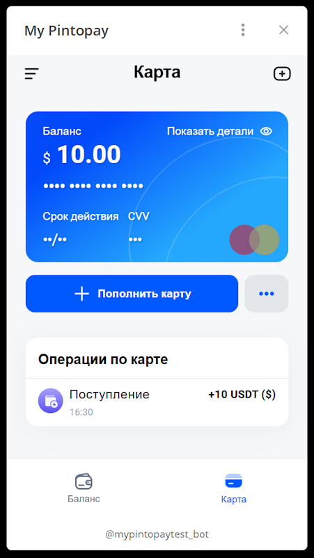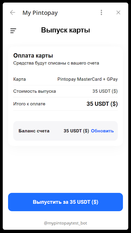 My Pintopay — Telegram-бот, с помощью которого вы сможете легко выпустить виртуальную карту MasterCard для оплаты на зарубежных сайтах.