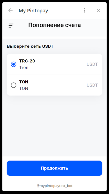 Пополнить баланс кошелька в My Pintopay можно на вкладке баланс. Поддерживаются USDT TON и TRC20, а также рубли при общении с оператором.