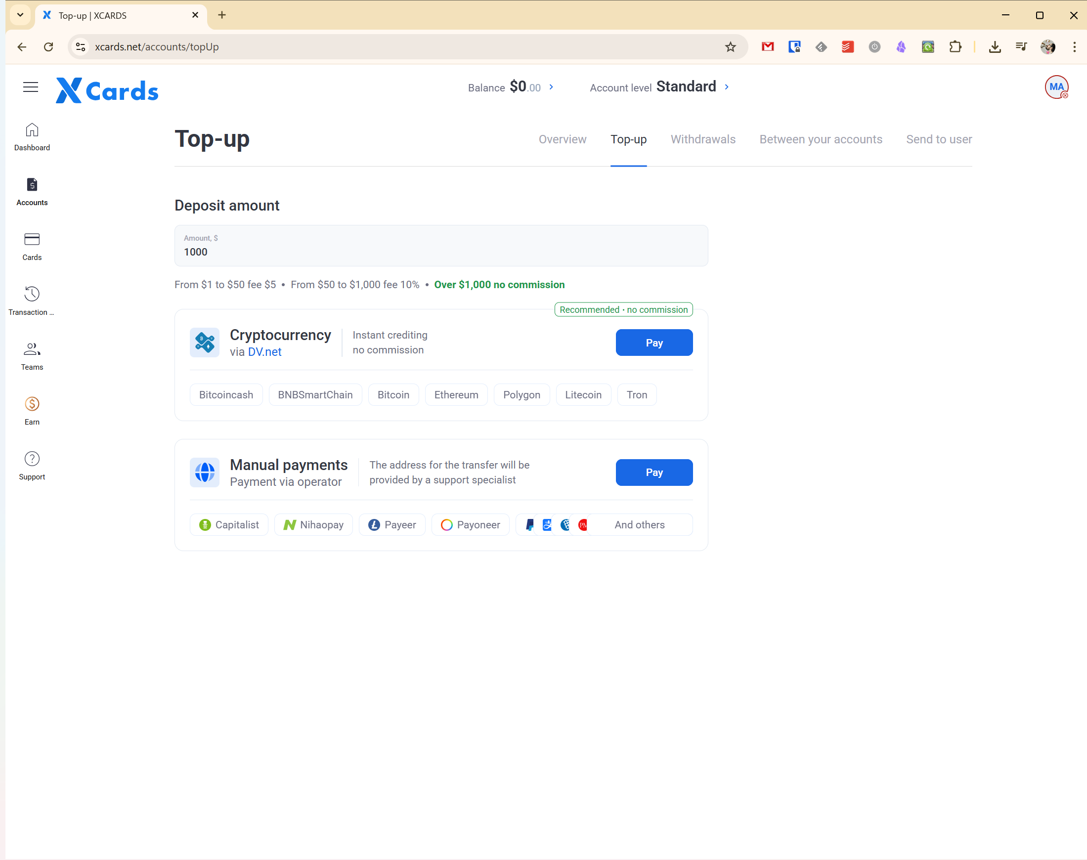 При пополнении до $50 с вас спишут $5 комиссии. До $1000 — спишут 10%, а свыше $1000 — комиссий уже нет.