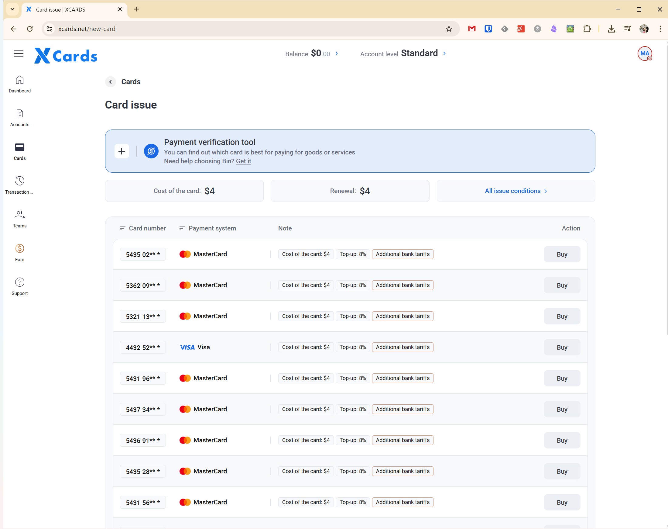 XCards для базовой работы не потребует от вас верификации, при этом он предлагает выбор из нескольких БИНов для вашей будущей карты.
