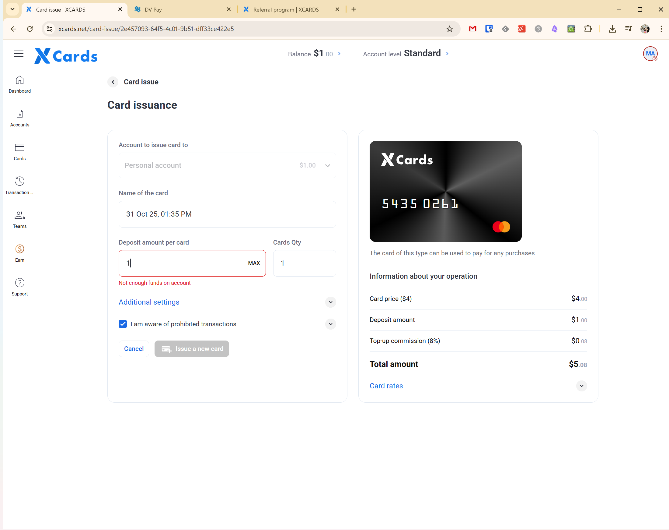 Если вы пополнили свой аккаунт, то по нажатию на кнопку Issue a new card будет выпущена новая карточка.
