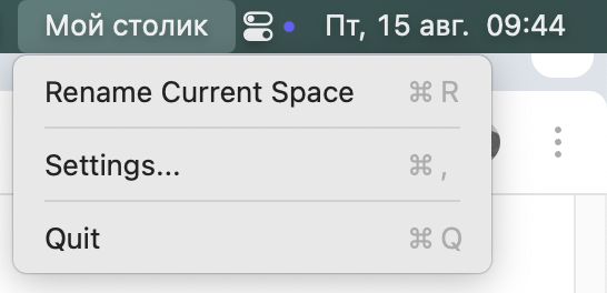 Просто нажмите пункт меню Rename Current Space или горячую клавишу и задайте нужное имя. После чего вы будете видеть его в Строке меню при переключении между столами.