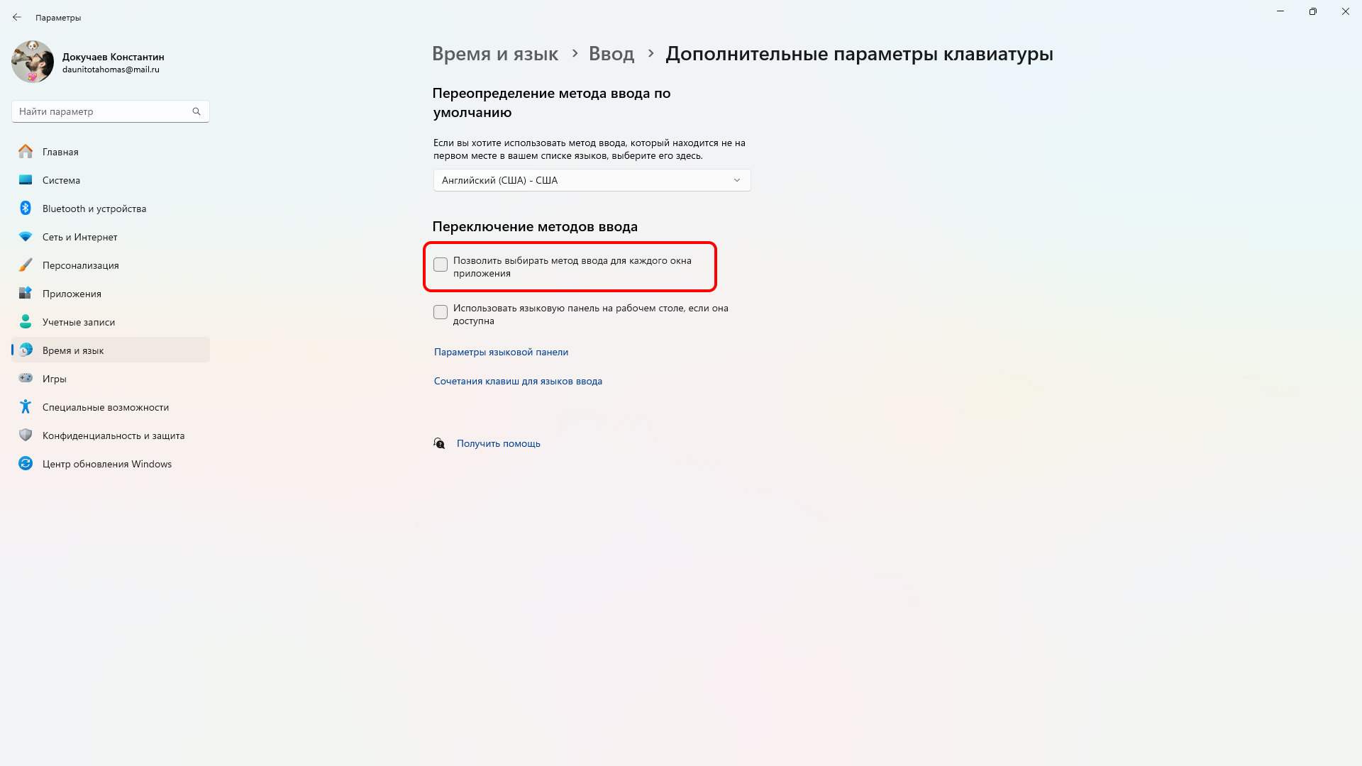 В открывшихся настройках нужно поставить галочку напротив пункта Позволить выбирать метод ввода для каждого окна приложения.