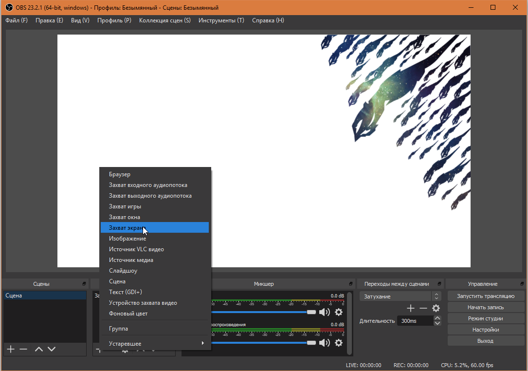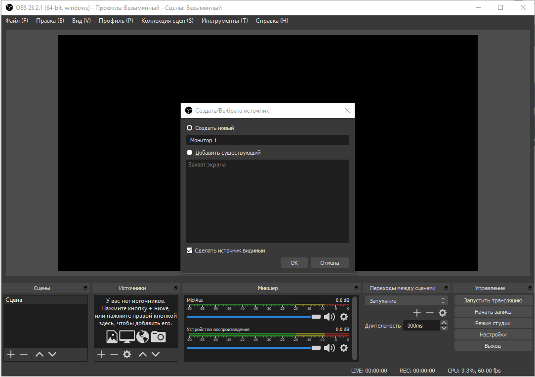 В противном случае удалите все источники, нажмите кнопку «+» в соответствующем блоке и выберите Захват экрана.