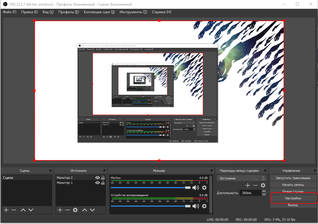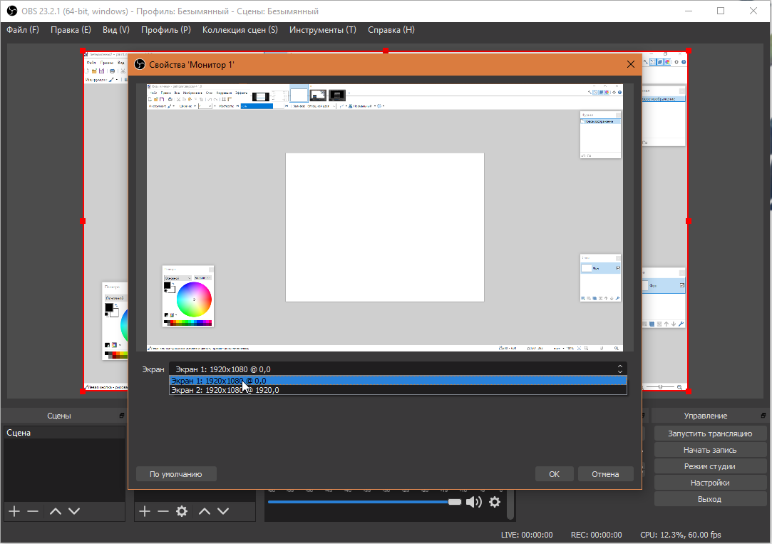 По умолчанию OBS будет записывать видео только с какого-то одного из монитора. Поэтому надо произвести ещё одну небольшую настройку.