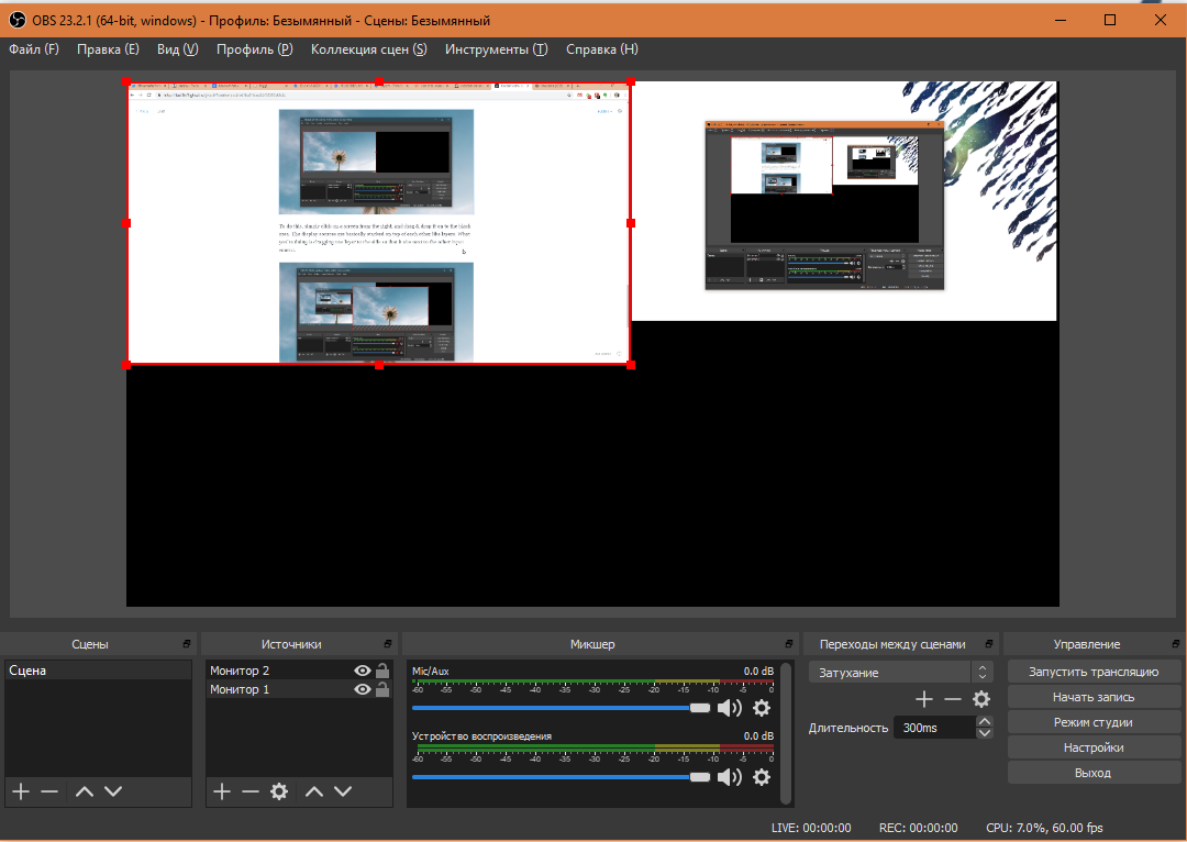 Теперь нужно выровнять картинки с обоих мониторов в OBS и после этого остаётся только нажать Начать запись.