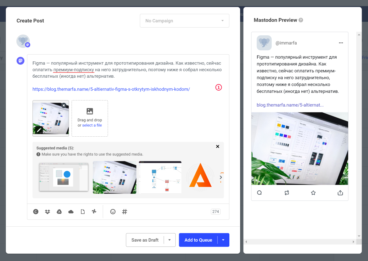 Выберите нужный вариант и в указанное время и дату публикация уйдёт в Mastodon.