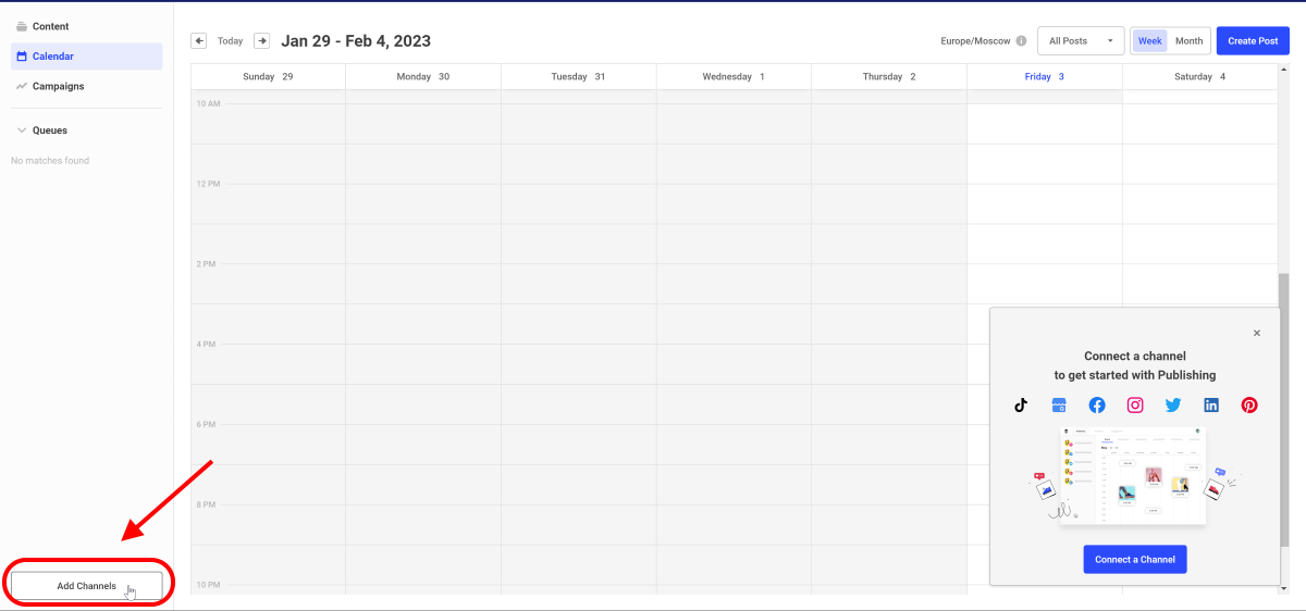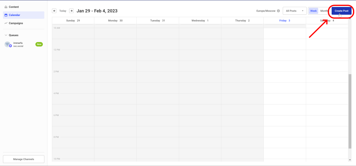 Чтобы создать и запланировать пост в подключённые сети нужно перейти в раздел Calendar и нажать кнопку Create Post.