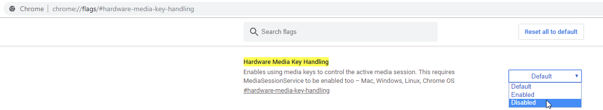 Исправить такое поведение очень просто. Откройте адрес chrome://flags/#hardware-media-key-handling и выберите пункт Disabled: