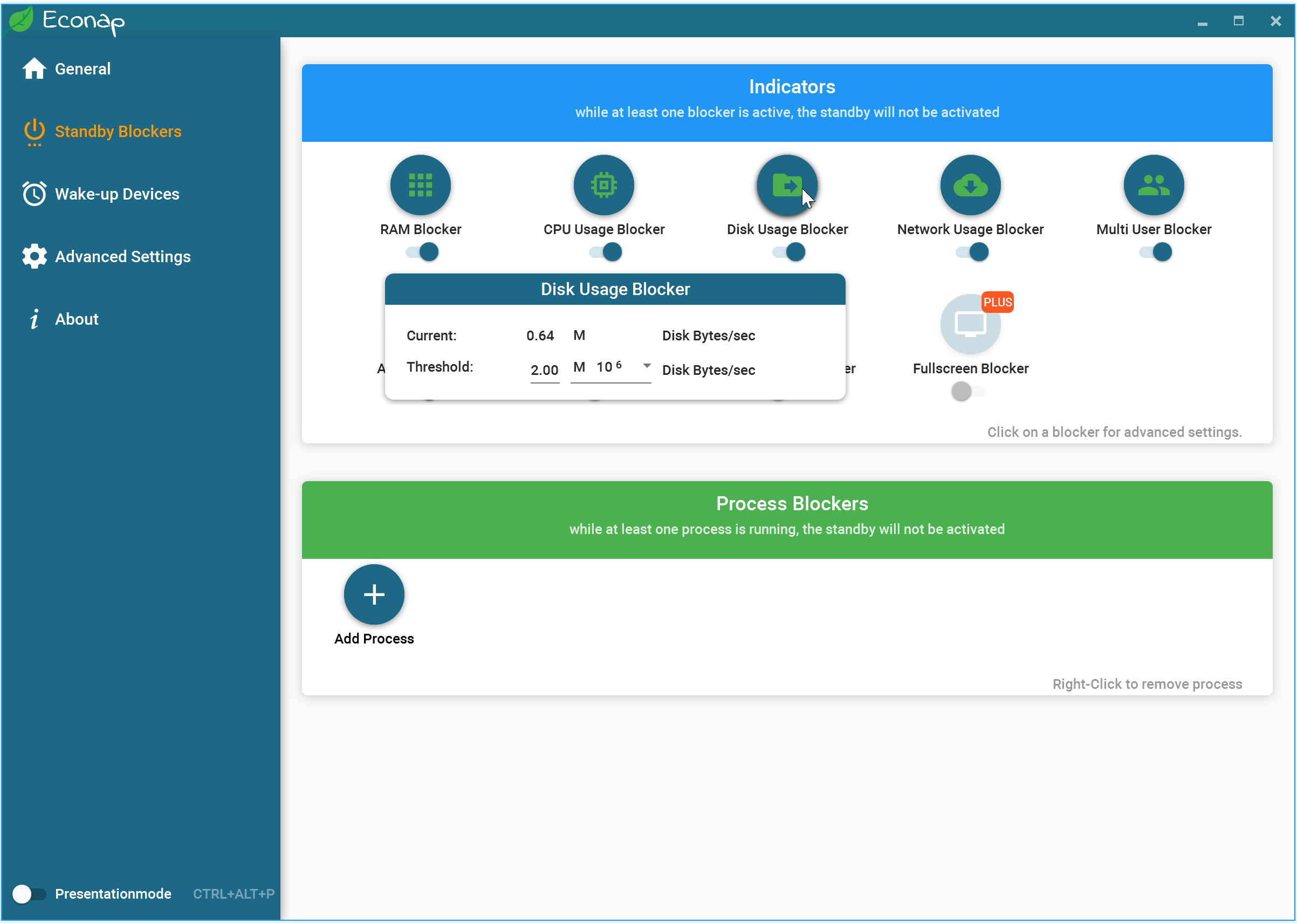 В разделе Stanby Blockers при помощи переключателей можно задать на какие параметры системы программа будет реагировать. Кликом по параметру можно настроить требуемый уровень нагрузки.