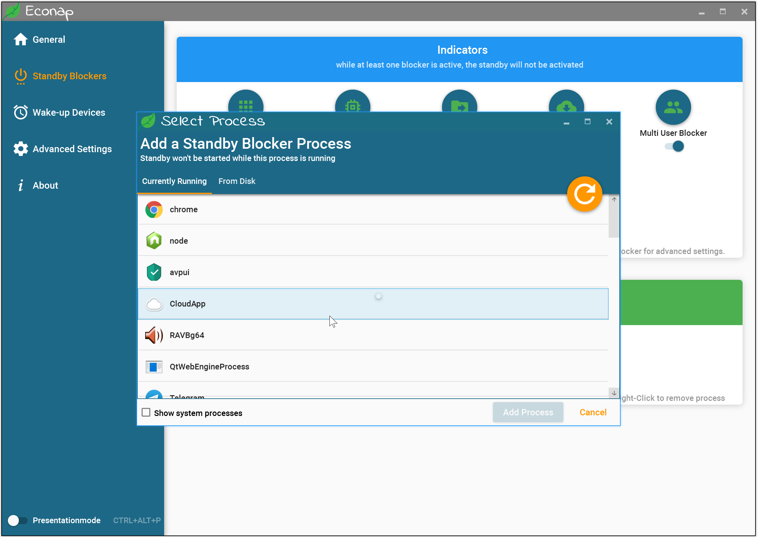 А на панели Process Blockers можно добавить процессы, при работе которых система никогда не уйдёт в гибернацию.