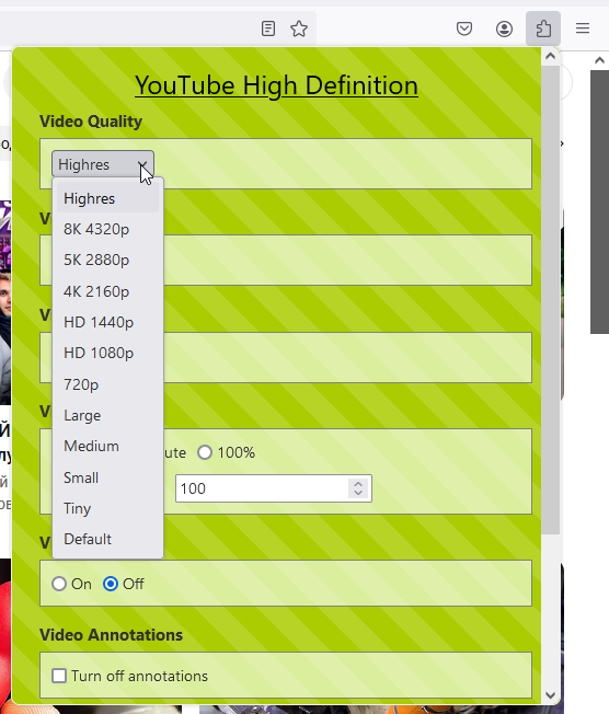 Этим ребятам я рекомендую установить YouTube High Definition. Вы сможете выбирать качество от 720p до 8K.