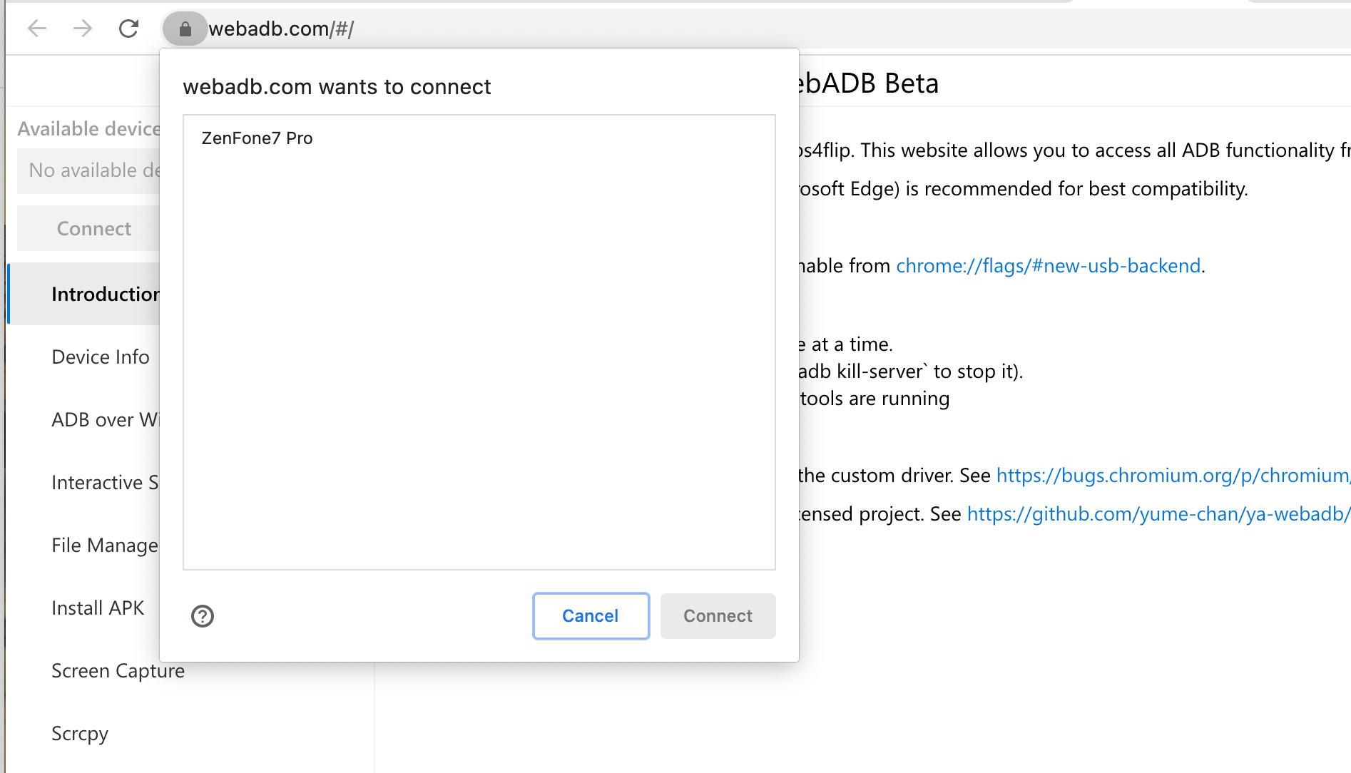 Из-за бета-тестирования WebADB нормальное функционирование приложения доступно только в ограниченном количестве браузеров. На сегодняшний день это Google Chrome и Microsoft Edge. Перед запуском ADB пользователь обязан убедиться в верном выборе обозревателя для интернета.
