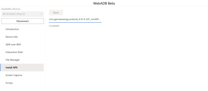 - Установка apk-файлов. Эта функция настолько же проста, как кажется при первом ознакомлении. После выбора установочного файла из списка доступных, приложение WebADB автоматически установит его в выбранном месте. На панели будет отображена вся детальная информация о проходящем событии. На данный момент доступна одновременная установка только одного apk-файла. Тем не менее пользователи приложения надеются, что в скором времени эта недоработка будет устранена.