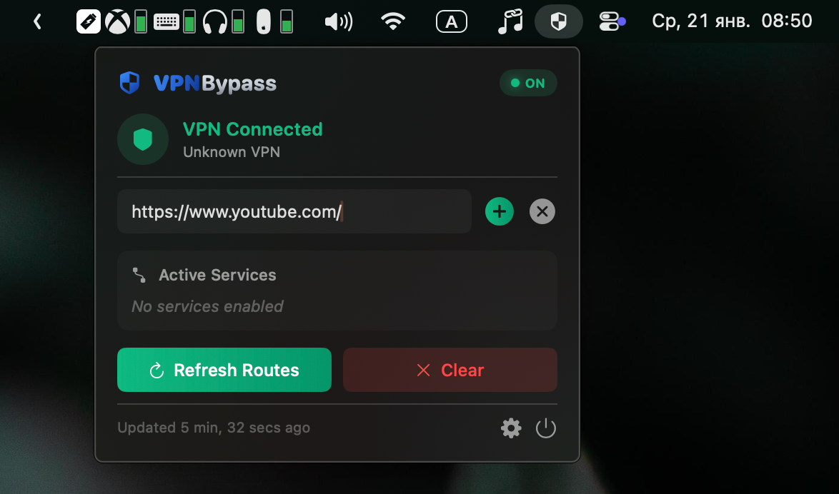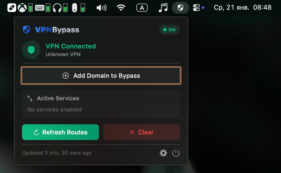 После её установки в Строке меню появится иконка. При клике на неё отобразится текущий статус соединения с VPN и список текущих соединений, которые будут ходить в сеть напрямую.