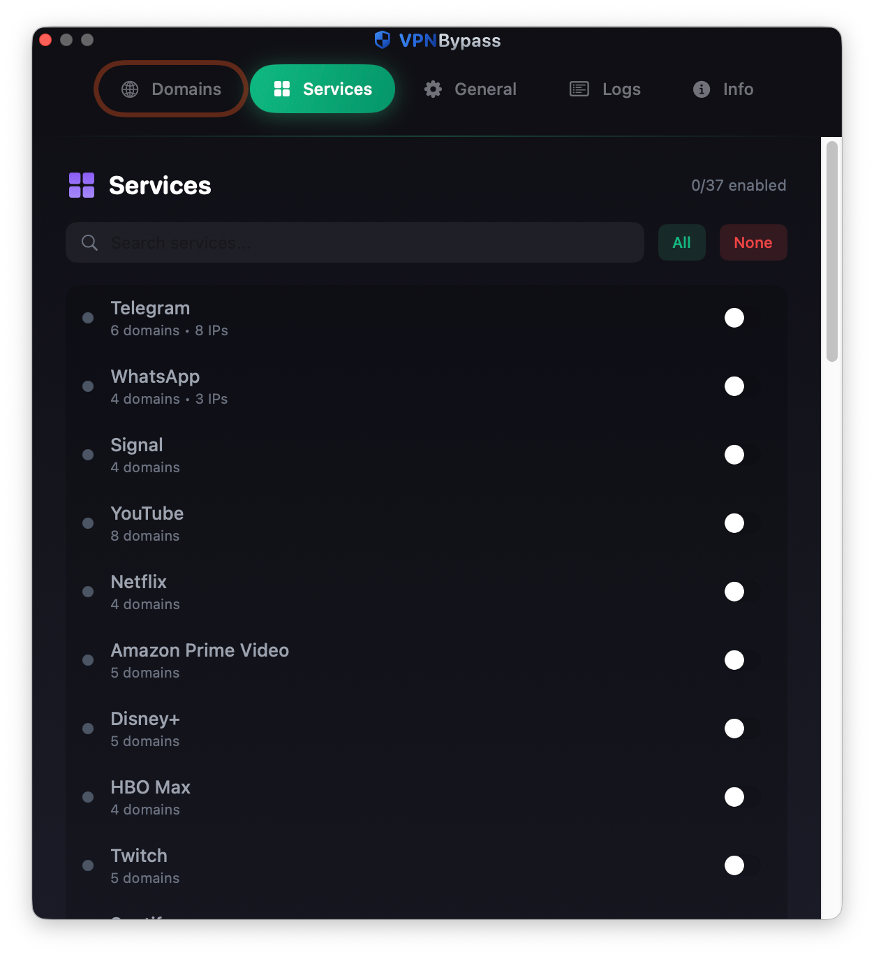 Чтобы не угадывать, какие адреса используют приложения, в настройках VPN Bypass в разделе Services можно добавить исключения для предустановленных наборов.