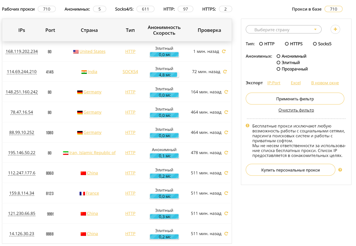 Для поиска бесплатного прокси можно воспользоваться специальной онлайн-базой прокси-листов https://free.proxy-sale.com/ . В ней каждый прокси проверяется на пинг, тип, страну, скорость соединения, степень анонимности. Платная подписка позволяет экспортировать прокси-лист в формате IP:Port и предоставляет API-доступ.