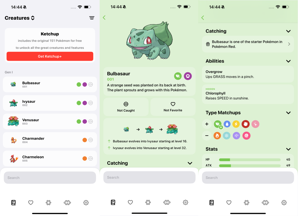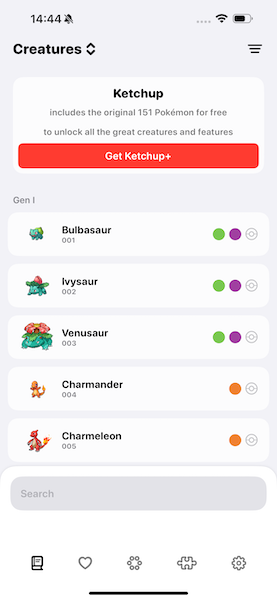 В целом Ketchup for Pokémon — приложение бесплатное, и все описанные функции вам будут доступны сразу. Но при оплате Ketchup+ стоимостью от 900 рублей вы получите доступ к полной коллекции покемонов, сможете фильтровать списки и просматривать старую информацию по покемонам.