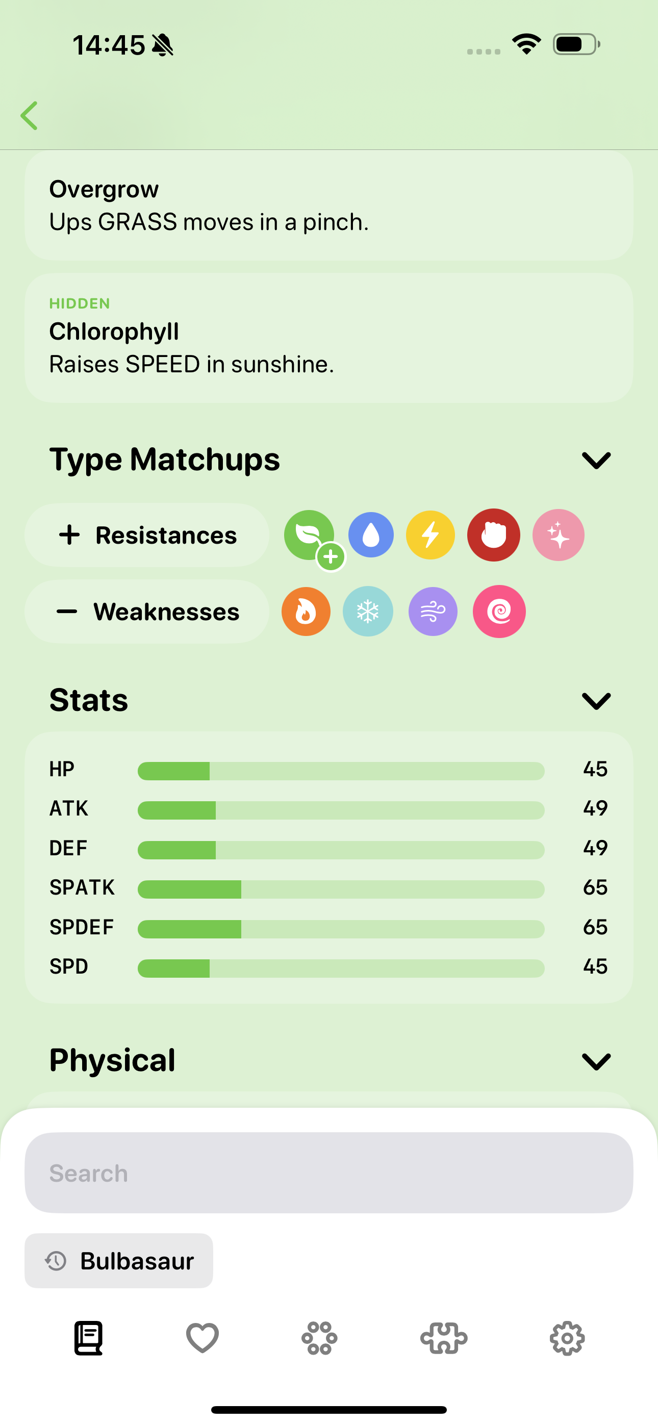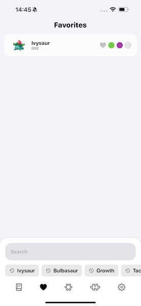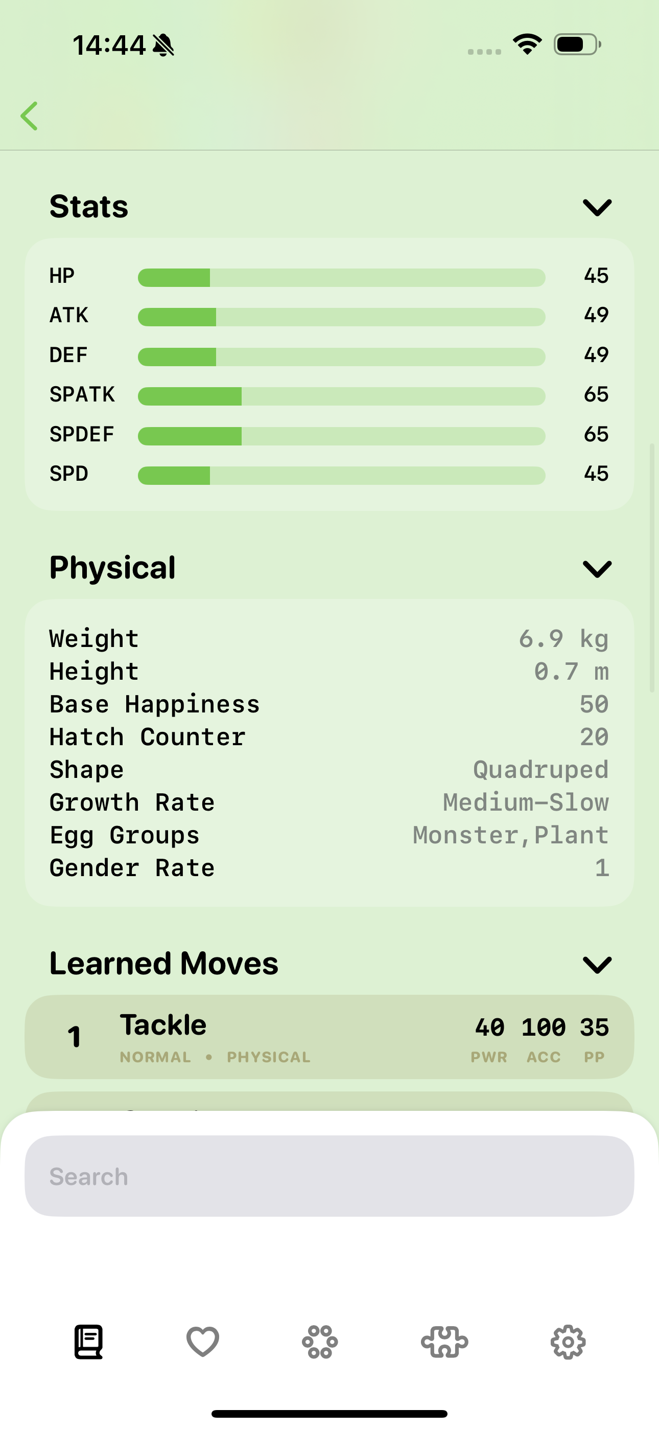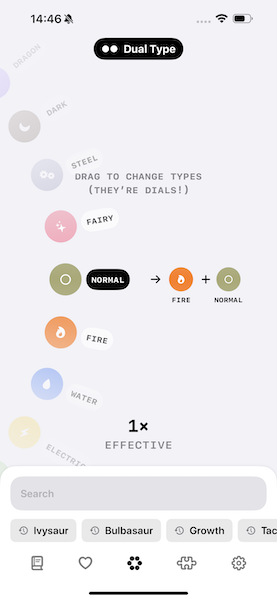 Первая и самая главная вкладка Ketchup for Pokémon. Здесь можно просматривать или искать покемонов по типу их формы. На главной странице отображаются стихии покемона и статус его поимки.