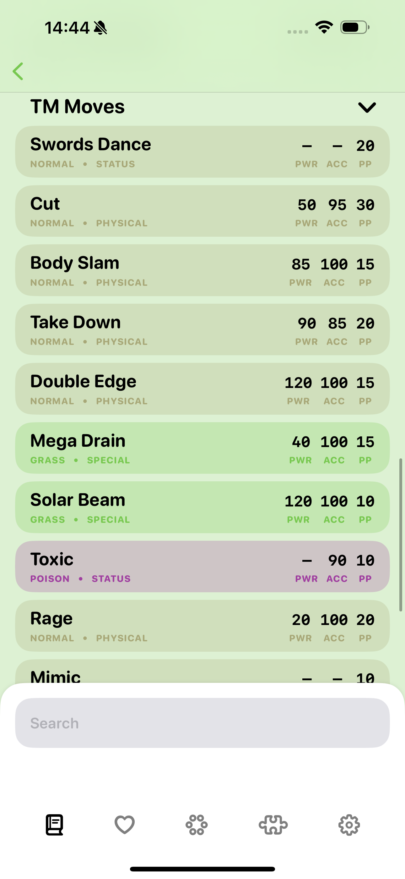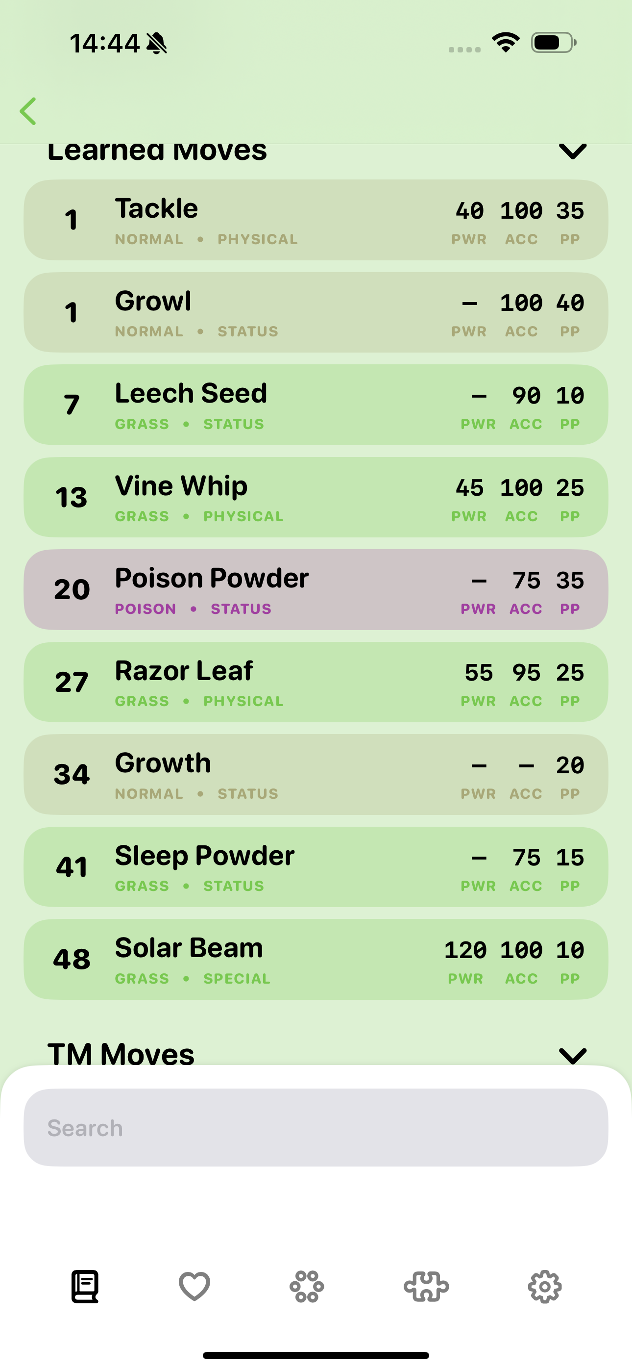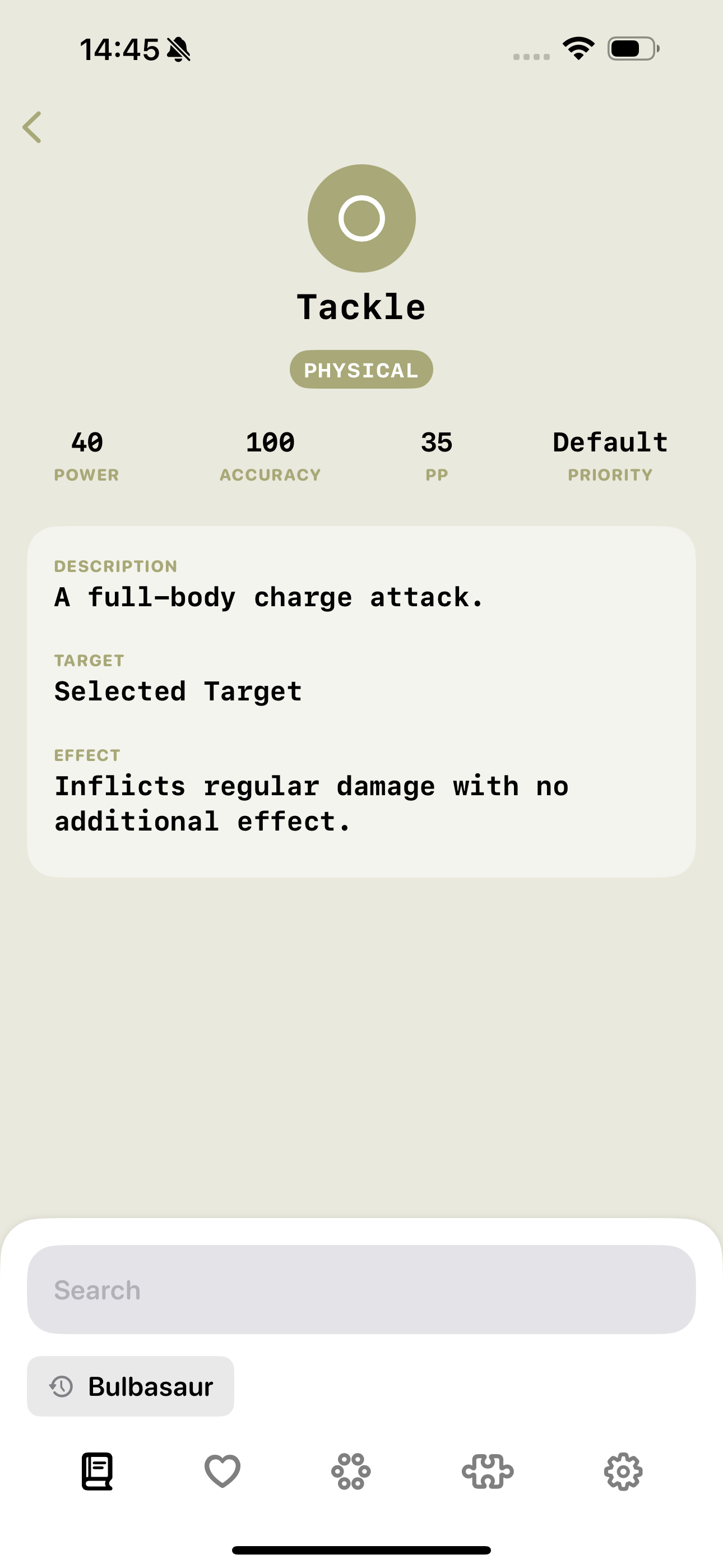 Первая и самая главная вкладка Ketchup for Pokémon. Здесь можно просматривать или искать покемонов по типу их формы. На главной странице отображаются стихии покемона и статус его поимки.