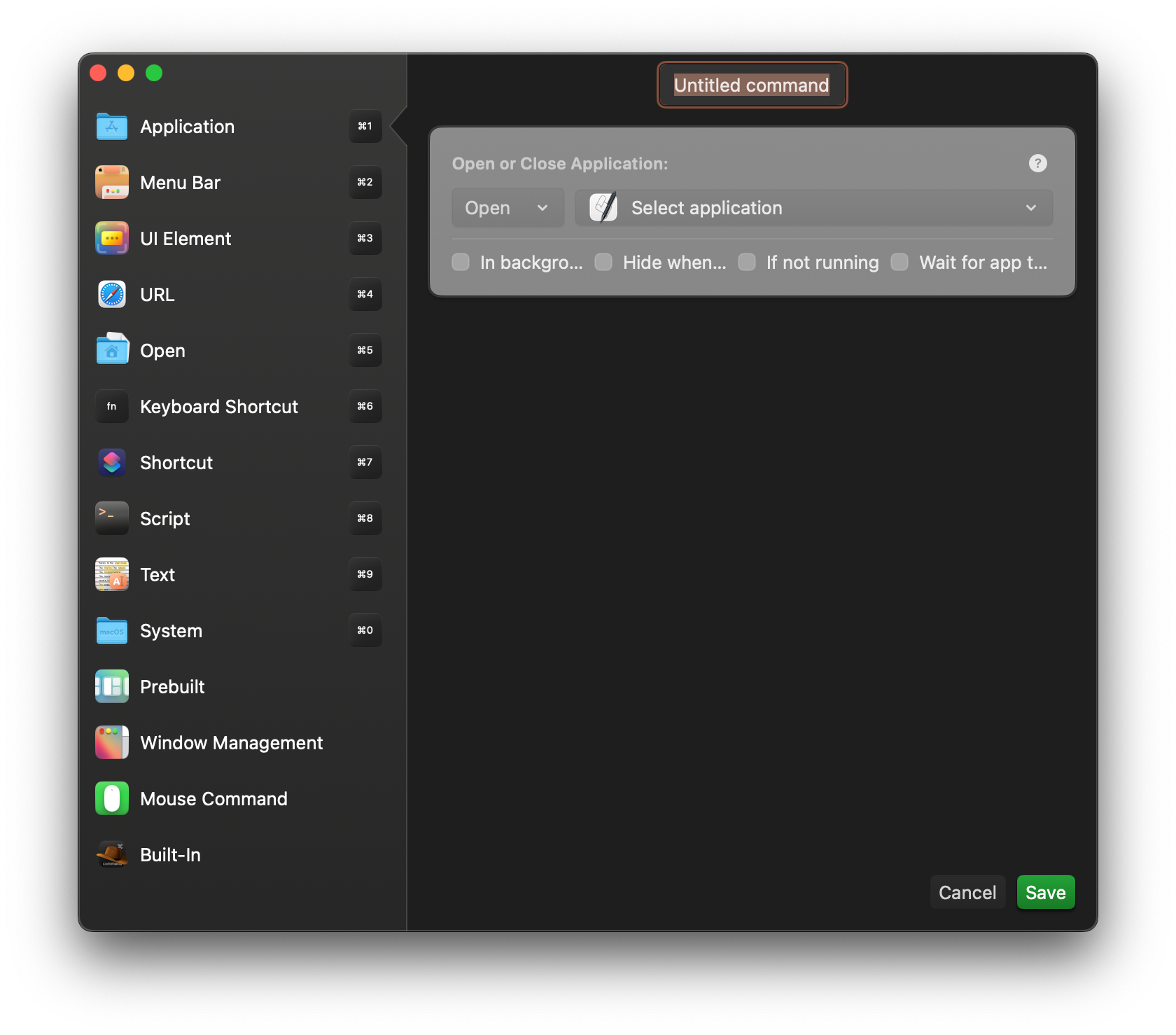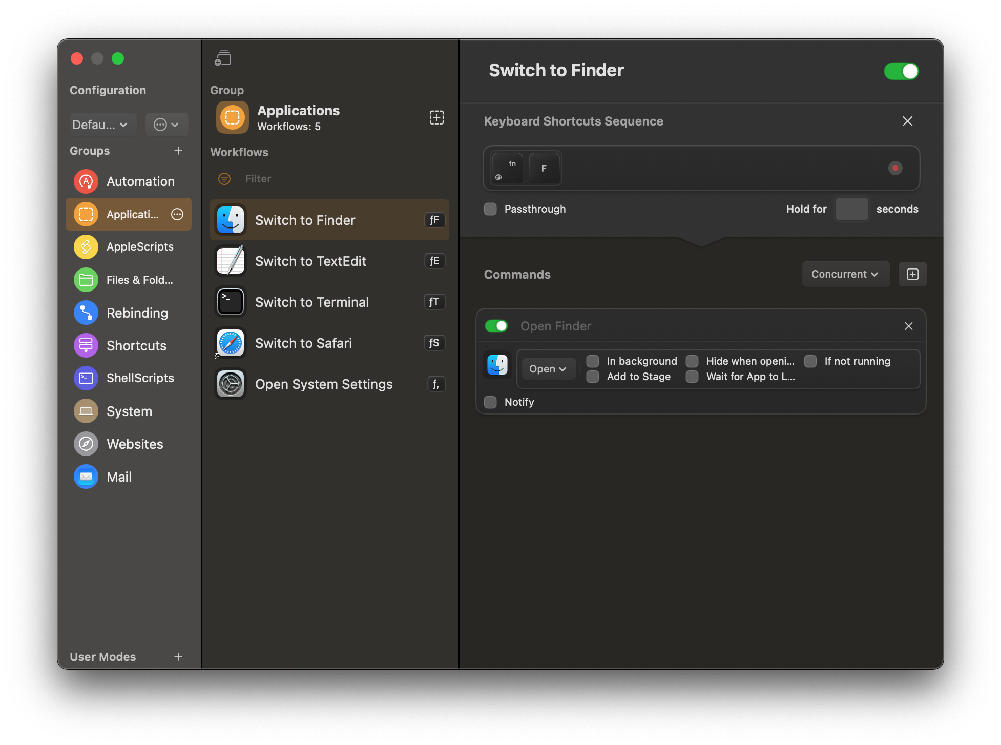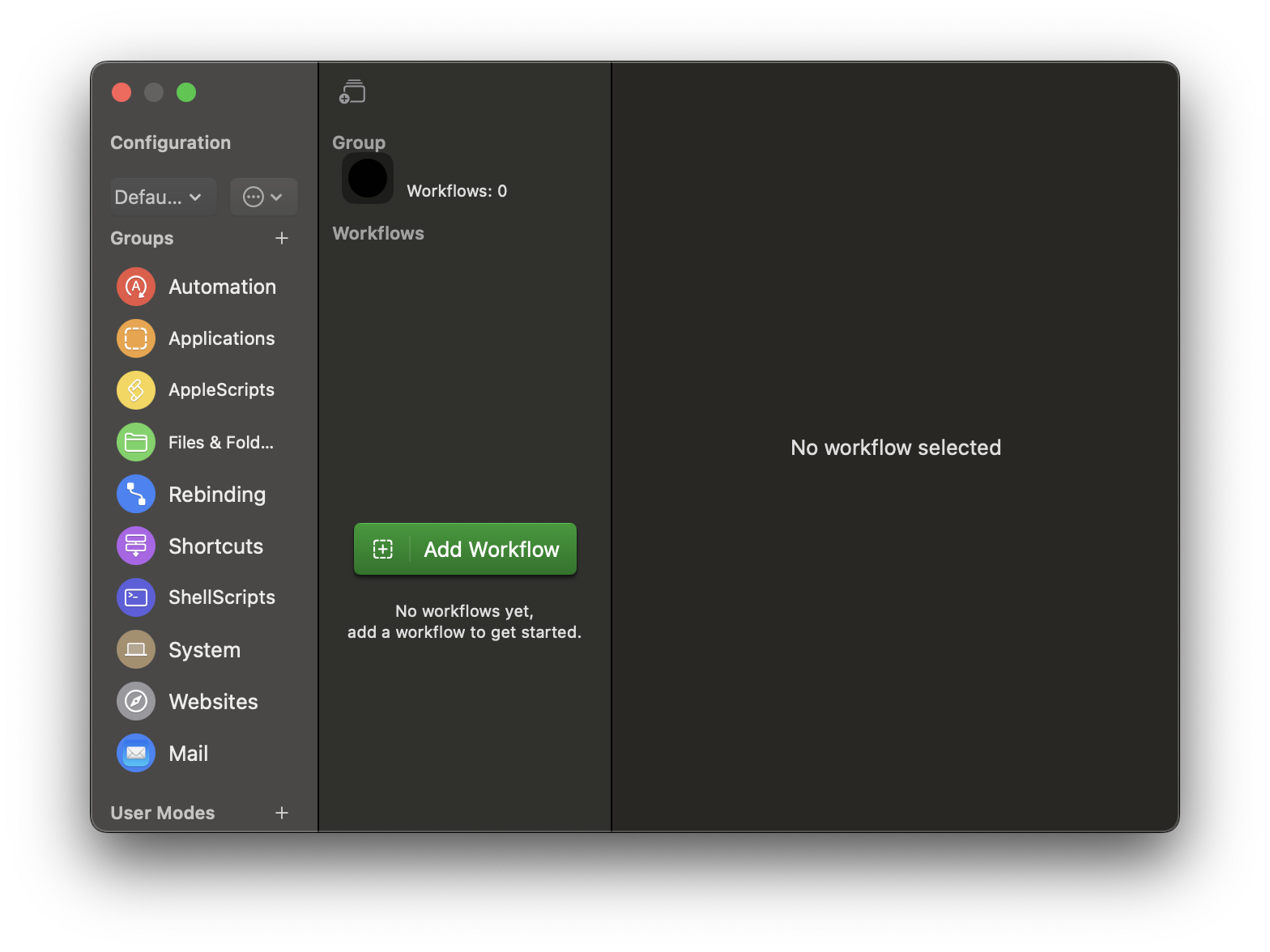 При выборе конфигурации Default вы увидите около десятка предустановок с разделением по категориям: автоматизация, приложения, AppleScript и многое другое.