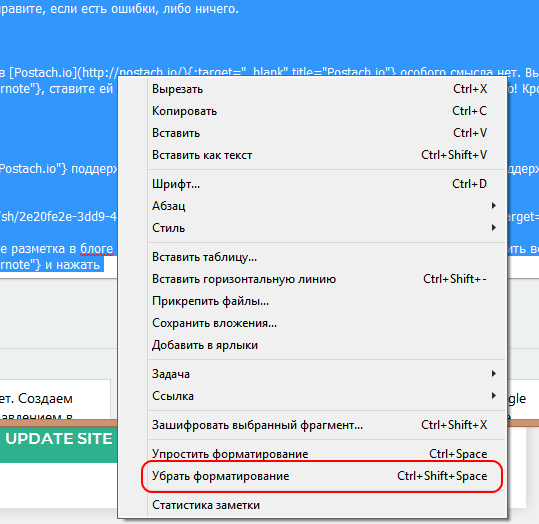 Во-вторых, если вы все сделали правильно, то в итоге разметка в блоге может разъехаться. Для того чтобы это исправить, нужно выделить весь текст заметки в Evernote и нажать "Убрать форматирование". После синхронизации разметка должна быть правильной.