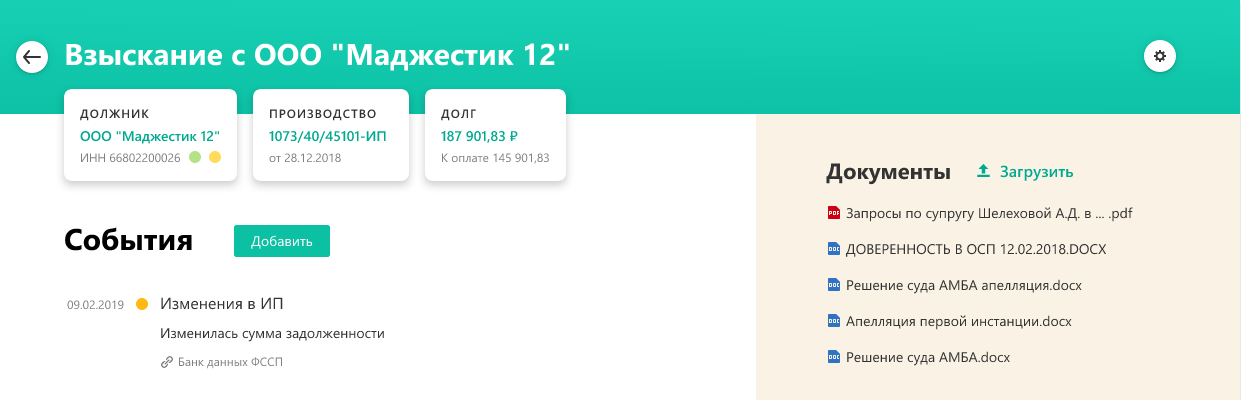 Благодаря сервису юрист имеет возможность безошибочно вести одновременно несколько дел о взыскании. Сервис автоматически вносит изменения в исполнительные производства, хранит все документы и комментарии.