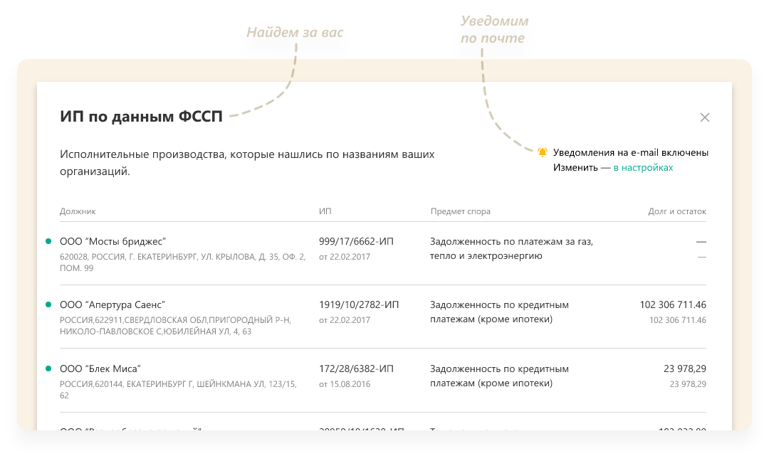 - Мгновенная автоматическая корректура информации по делам — наименование должника, время запуска и номер исполнительного дела, реквизиты исполнительного постановления, величина или остаток долга и другие данные;