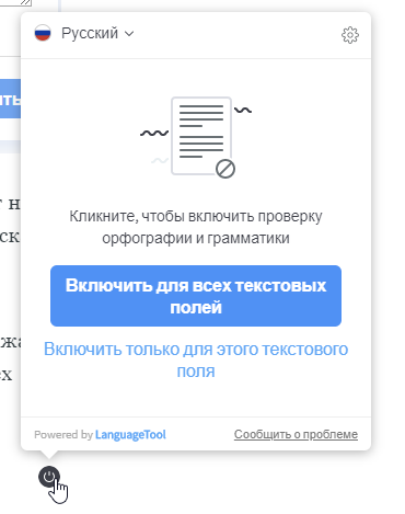Если вы отключили автопроверку, то для проверки текста нужно будет нажать в правом нижнем углу на иконку LanguageTool и выбрать Включить для всех текстовых полей или только для текущего.